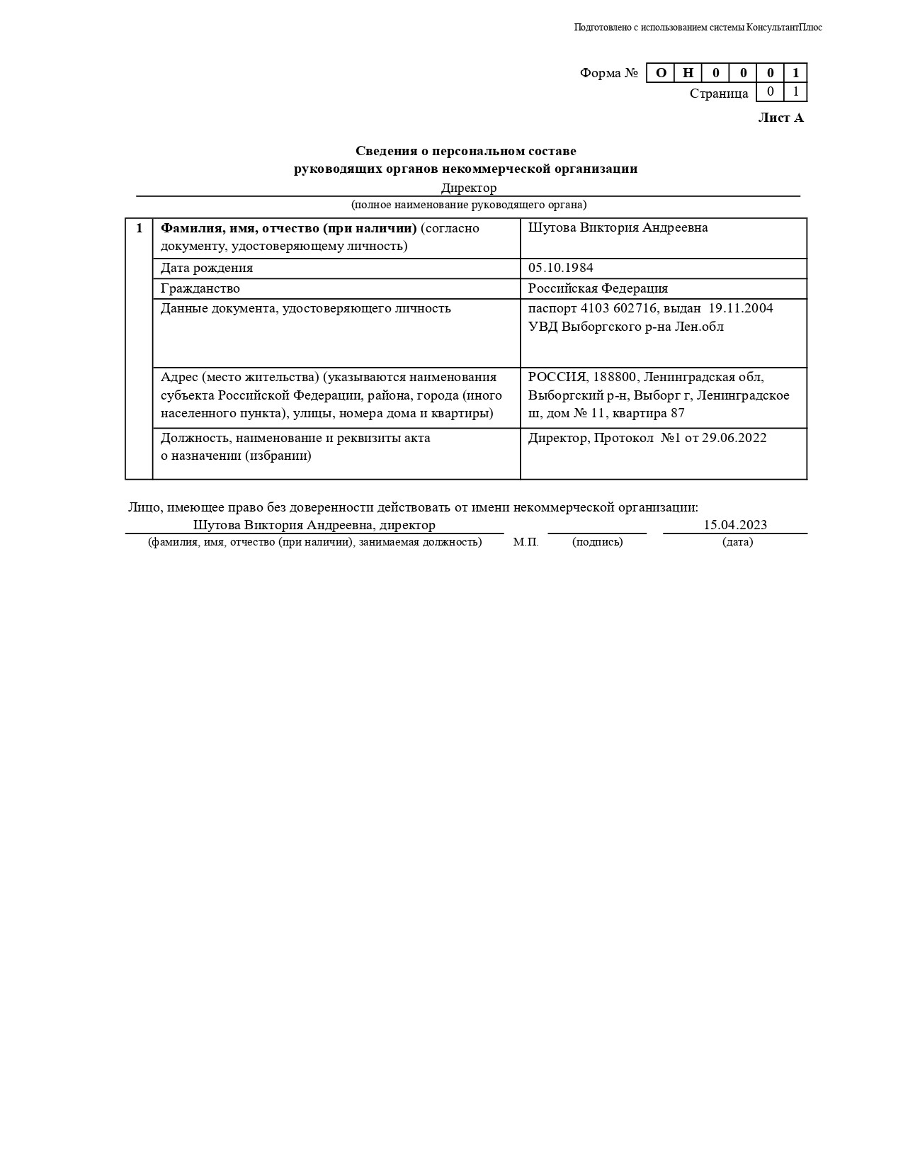 Адрес места нахождения: 188800, Ленинградская обл, Выборг г, Кривоносова ул, дом № 15